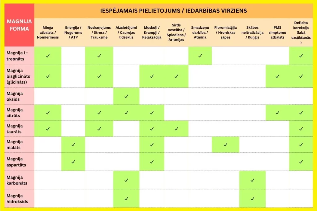 Turklāt magnijs veicina organisma dabiskās aizsargspējas pret iekaisumu, palīdz veidot un uzturēt muskuļus, nodrošina stabilāku cukura līmeņa kontroli asinīs, atbalsta vielmaiņu, var palielināt enerģiju un palīdz uzturēt kaulus stiprus un veselīgus, bet magnijam ir vairāk nekā 10 dažādu savienojumu formu, kuras tiek izmantotas uztura bagātinātājos vai medicīnā. Katrai no tām ir savas īpašības, uzsūkšanās spēja un iedarbība uz organismu.